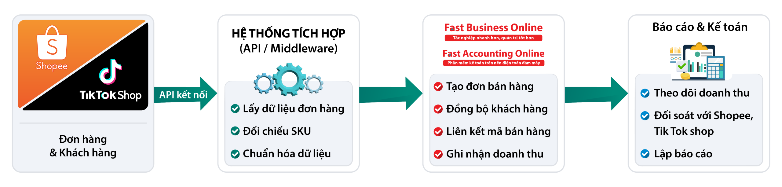 Các phần mềm FAST có thể kết nối với các sàn TMĐT thông qua API tích hợp. Khi kết nối được thiết lập, dữ liệu bán hàng từ các sàn sẽ được tự động đưa về FAST để phục vụ quản lý bán hàng và hạch toán kế toán.
